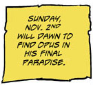 As the country excitedly awaits our great quadrennial political climax, a smaller subset looks toward the first week of November with great anxiety and dread. On Sunday, Nov. 2, the comic “Opus” will end. Worse yet, creator Berkeley Breathed has made it clear that the strip’s namesake will, in that final strip, find his“final paradise.”