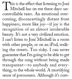 Ma tra le altre cose su Joni Mitchell di cui scrive Zadie Smith c’è una riflessione sull’effetto emotivo incontrollabile che genera certa musica in certe persone, questione su cui si è studiato e scritto tantissimo, e assai familiare a molti, chi più, chi meno. Negli anni scorsi sono usciti diversi libri interessanti su questo tema, da quello di Oliver Sacks a quelli di Daniel Levitin: e io sono arrivato alla conclusione che per alcuni la musica abbia gli stessi effetti di dipendenza, alienazione e piacere misto a malinconia dati da certe droghe. Zadie Smith ne scrive così: