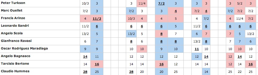Secondo i diversi servizi di scommesse – raccolti in una tabella su un sito che credo di non poter linkare, ma non me ne dispiaccio – i più probabili successori di Ratzinger sono questi. Come dice un mio amico, questi fanno sul serio, trattandosi di soldi.